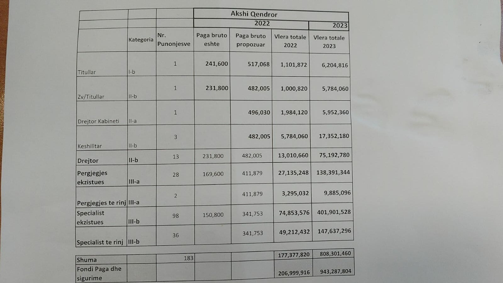 Sipas propozitimit të AKSHI-t,paga e zv/titullarit, kategoria e II-b që aktualisht është 231,800 lekë të bëhet 482,005 Lekë. Nga ana tjetër, për drejtor kabineti të kategorisë së II-a, që nga kërkesa e dërguar duket se është një pozicion bosh (ose inekzistent) aktualisht në AKSHI, kërkohet që rroga për 2023 të jetë 496,030 lekë të reja. Rroga mbi 4 milionë të vjetra janë kërkuar edhe për drejtorë dhe këshilltarë.