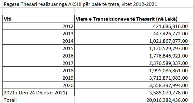 Tre vitet me transaksionet më të larta janë vitet 2019,2020 dhe 2021 me shuma respektive prej 3,712,871,083.00 lekë, 3,558,397,994.00 lekë dhe 3,585,079,778.00 lekë.