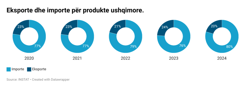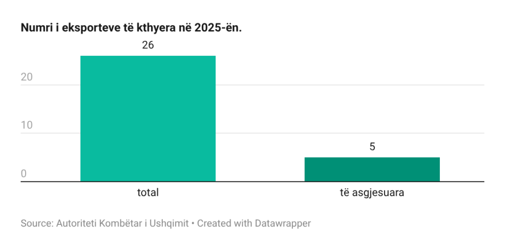 Sipas të dhënave të siguruara nga Autoriteti Kombëtar i Ushqimit, gjatë vitit 2025 janë regjistruar 26 raste eksportesh të kthyera nga vendet e Bashkimit Europian. Nga këto, vetëm 5 janë asgjësuar dhe 4 janë rieksportuar. Pjesa tjetër, me masën prej rreth 130 ton, është rikthyer në tregun e brendshëm.