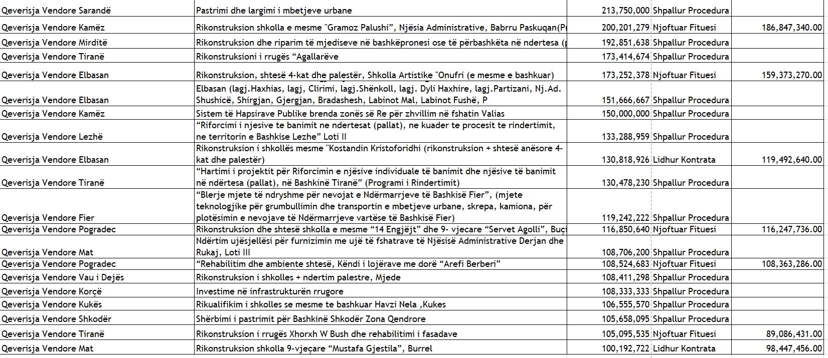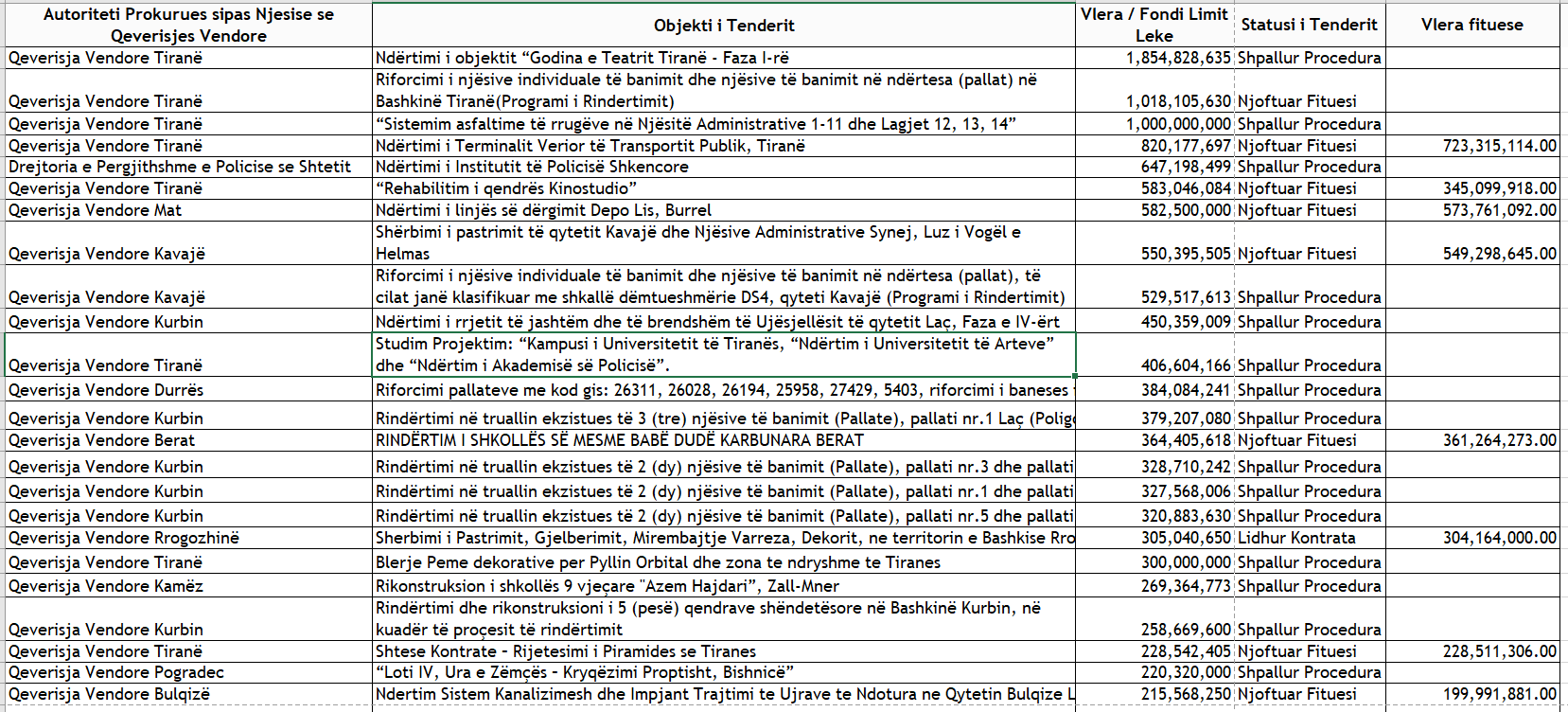 Konkretisht nga muaji gusht deri në nëntor të vitit 2021, bashkitë shpallën në total 17 tendera me vlerë mbi 100 milionë lekë. Fondi limit ishte rreth 5.5 miliardë lekë.