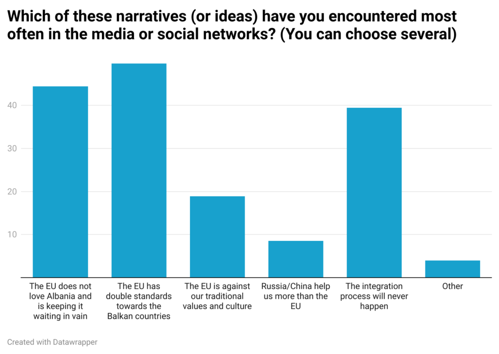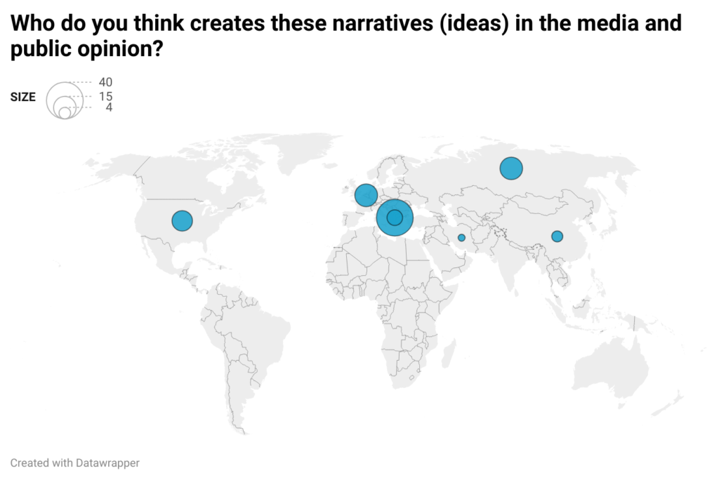 The respondents also think that these narratives come mainly from our own country. For the respondents, most of them are created by the government, as a form of justification for the stalled negotiations by blaming the EU. This intensifies during campaign periods. Another part also originates from the opposition, which tries to build its public discourse using all the resources it can.