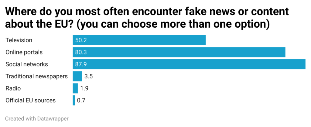 The same line is followed by the opinions of the surveyed citizens. About 88% of them encounter disinformation about the EU on Social Networks. While about 80% encounter it on online media and half of them encounter it on television. Media analyst, Çelik Rruplli, agree with this. He also states that: “Social Networks is often the source of the distribution of disinformation and also their amplifier at a second moment after they are commented on and re-distributed”.