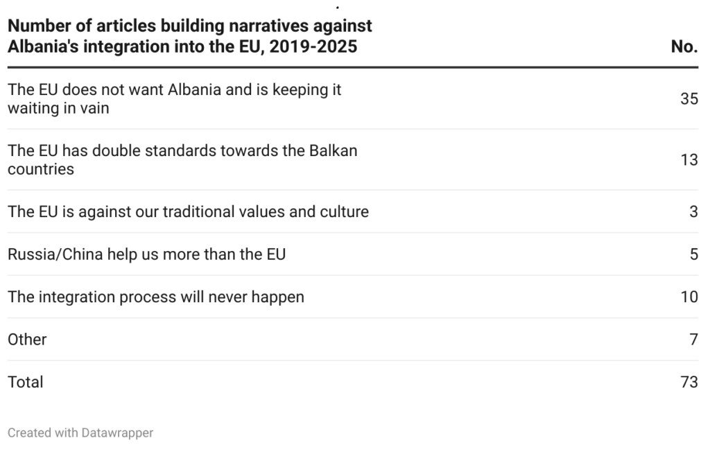 A total of 73 media articles published between 2019 and 2025 were analyzed. Articles were selected from major online outlets (Top Channel, BalkanWeb, Syri.net, FaxNews, Tema.al, Euronews Albania, etc.) using keywords such as “EU integration”, “Europe”, “Anti-Europe”, “Russia”, and “China”. Each article was coded for tone (pro-EU, anti-EU, neutral), type (news, commentary, blog), and narrative category (e.g., “EU doesn’t want Albania”, “EU has double standards”, etc.). To verify the authenticity of the narratives, the analysis cross-referenced disputed content with EUvsDisinfo and other fact-checking databases such as Faktoje.al and Disinfo.al. By analyzing those collected articles, we identified five narratives. Our analysis of the articles shows that about 40% were republished from Russian-affiliated domains.