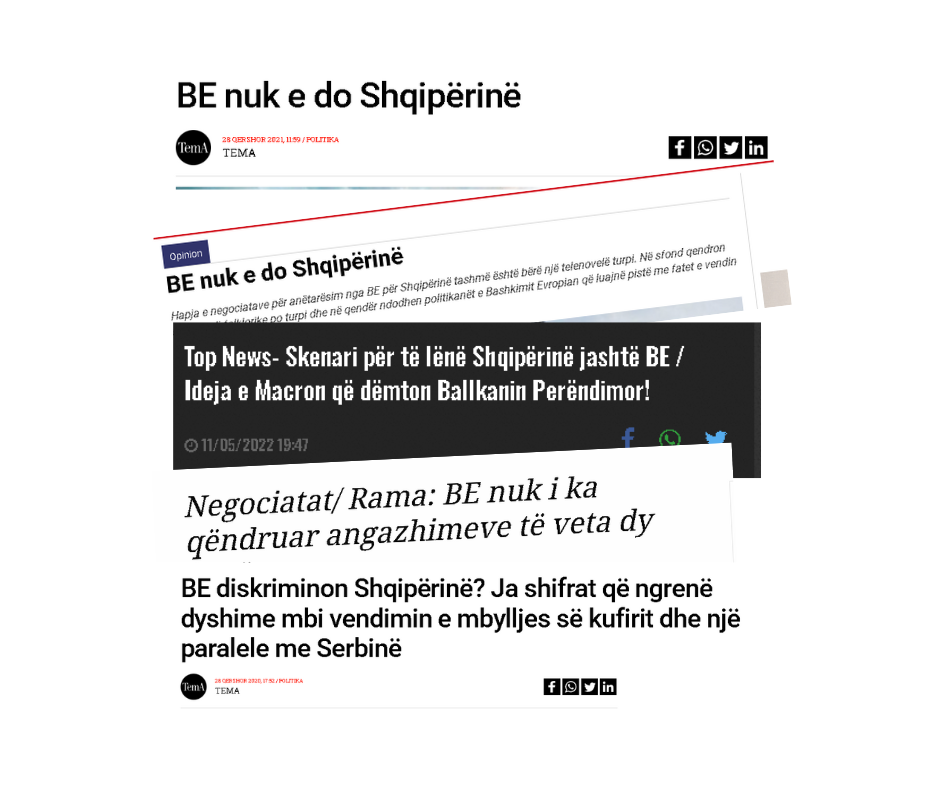 The headlines in the graphics below appear to build the narrative that the EU does not want Albania and is keeping it waiting in vain. The articles range from news from major media outlets to the opinions of political and geopolitical analysts, who emphasize that the European Union does want love Albania and for this reason is dragging out the process, lying to it time to time, or that the EU itself is not keeping its commitments and promises to which it has pledged.