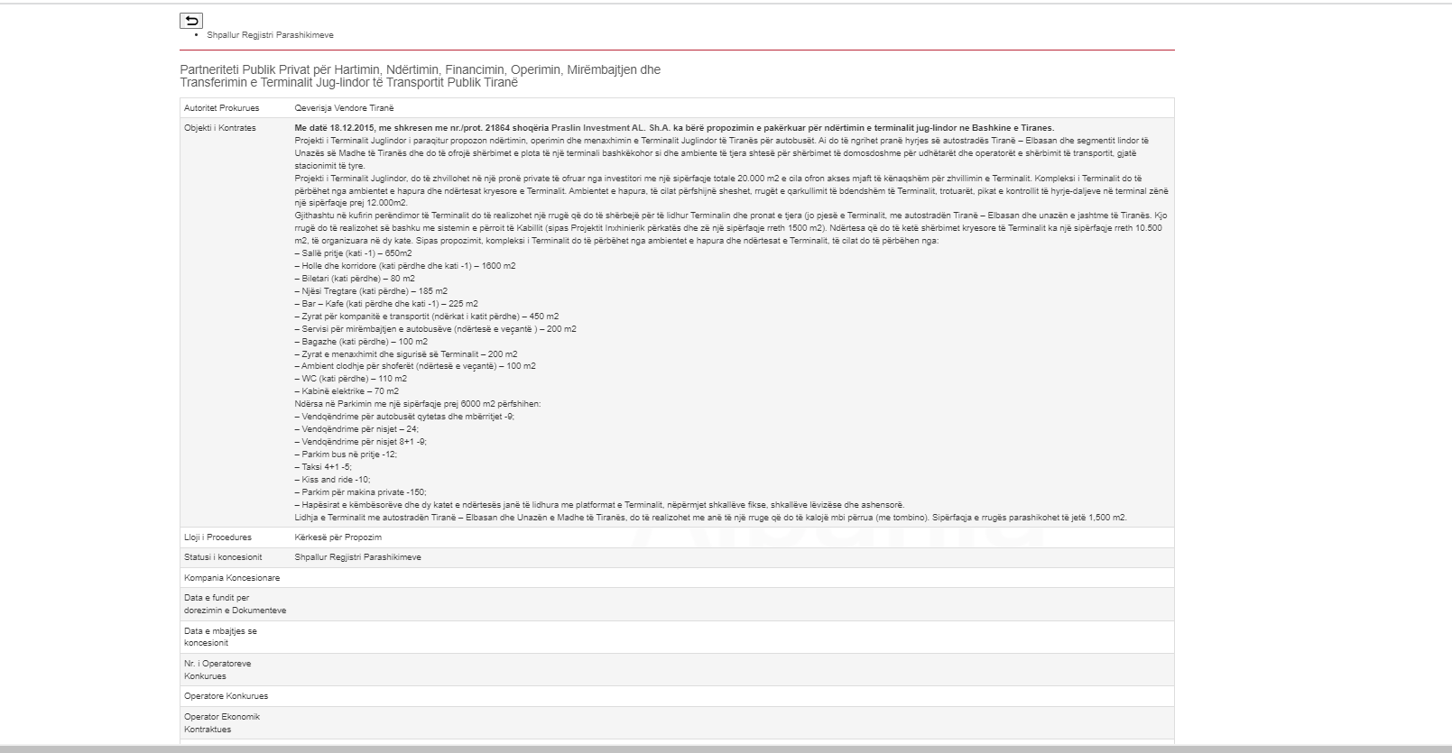 Që në vitin 2015 shoqëria “Praslin Investment AL. Sh.A” ka bërë propozimin e pakërkuar pranë Bashkisë Tiranë për ndërtimin e Terminalit Juglindor pranë hyrjes së autostradës Tiranë-Elbasan, në segmentin lindor të Unazës së Madhe të Tiranës. Në përshkrim thuhet se projekti do të zhvillohet në pronën me sipërfaqe totale prej 20.000 m2 të ofruar nga investitori. Kohëzgjatja e koncesionit, sipas propozimit të kësaj shoqërie shkon në 20 vite.